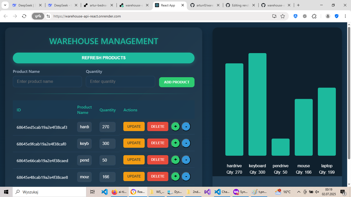A simple warehouse inventory management application built with React, Express, and MongoDB. The system provides complete CRUD (Create, Read, Update, Delete) functionality for product inventory with real-time data visualization.