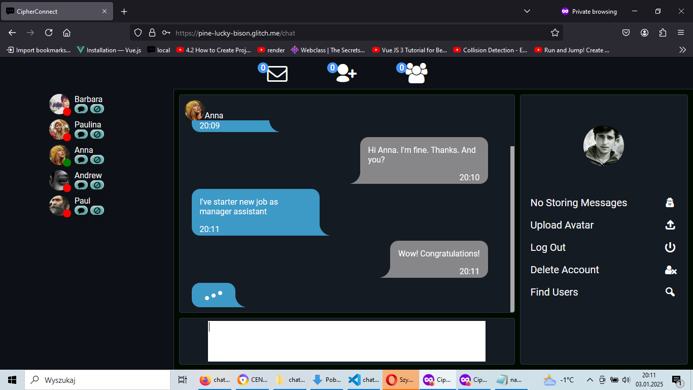 Cipher Connect allows seamless communication between users. Messages are delivered instantly to connected parties using WebSocket technology. Authentication is handled securely with JSON Web Tokens (JWT), an authorization standard that protects the privacy and integrity of conversations. The application uses an SQLite database to store credentials, messages, and interactions. Sensitive information is encrypted with advanced cryptographic algorithms to ensure maximum security.